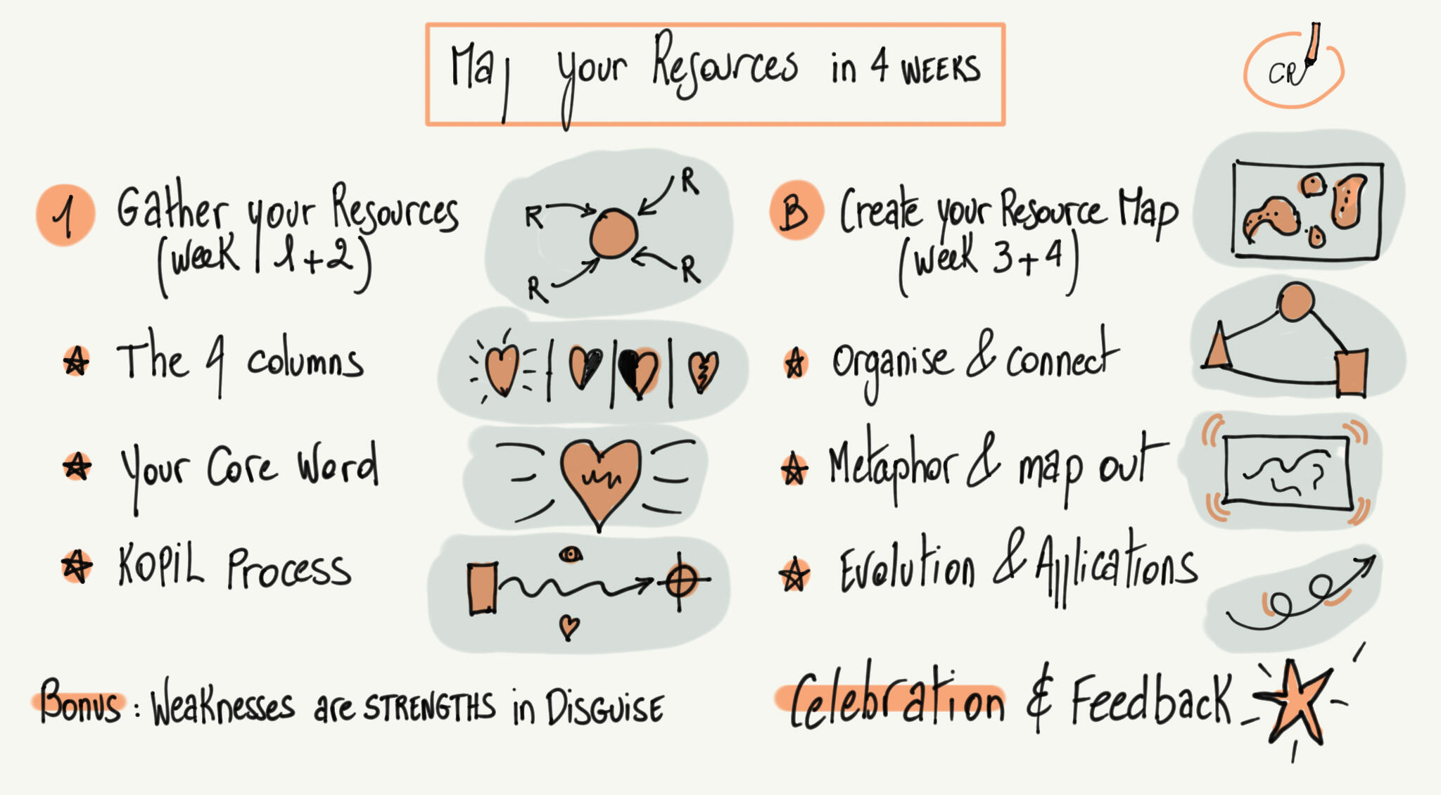 We are going to follow a process of 4 steps, each one building on the precedent session to help you get clear on your resources and strengths. At the end of the program, you will bring home your own Map of Resources, a great foundation if you want to then get clear on your projects (but that is another program). 😊