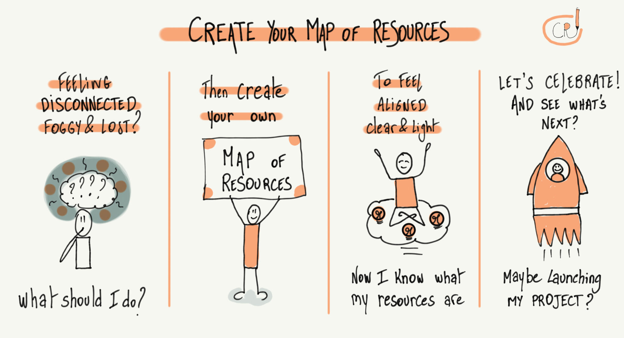 I'm here to help you launch your meaningful project through a beautiful process of clarifying, designing and experimenting with your own resources making your own Map of Resources, Self-care kit and your own plan of action.